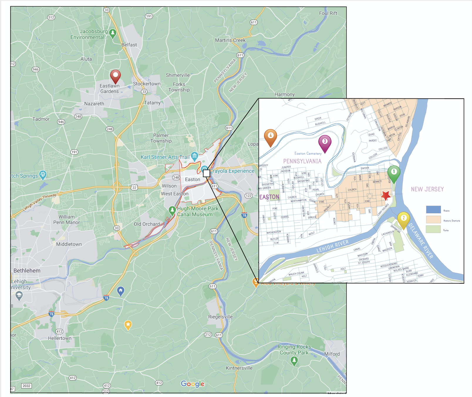 The Delaware & Lehigh National Heritage Corridor (D&L) offers visitors extensive outdoor recreation and heritage tourism exploration. The 48-mile central part of the trail, known as the Lehigh Valley section, runs through the heart of Easton and offers visitors access right from downtown to hiking, biking, and exploration to both the northern and southern parts of the trail. The D&L Heritage Corridor provides entry to the many attractions in the historic towns and villages throughout the region. For a walking guide to nearby trails and information on where to find other natural areas, click here.