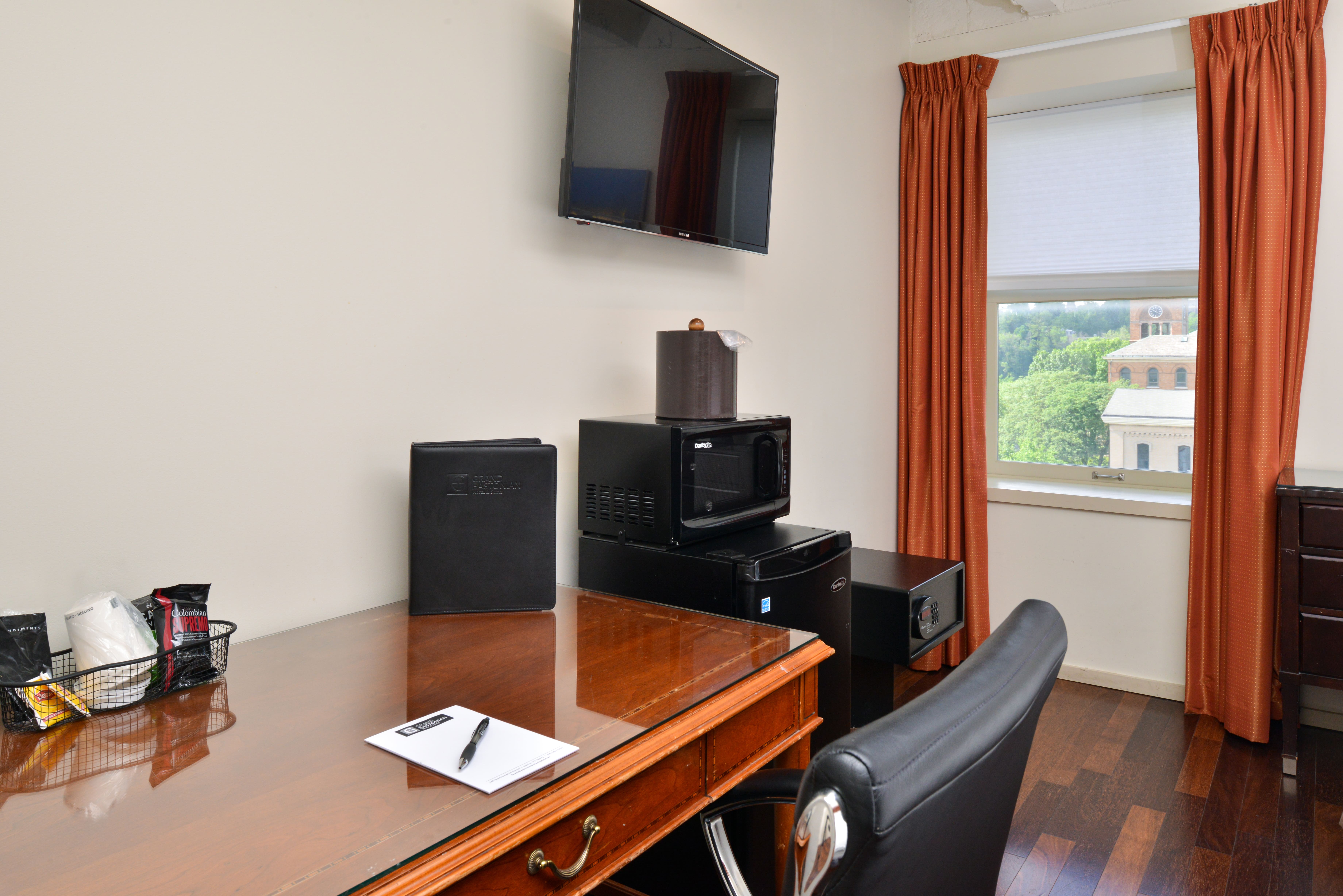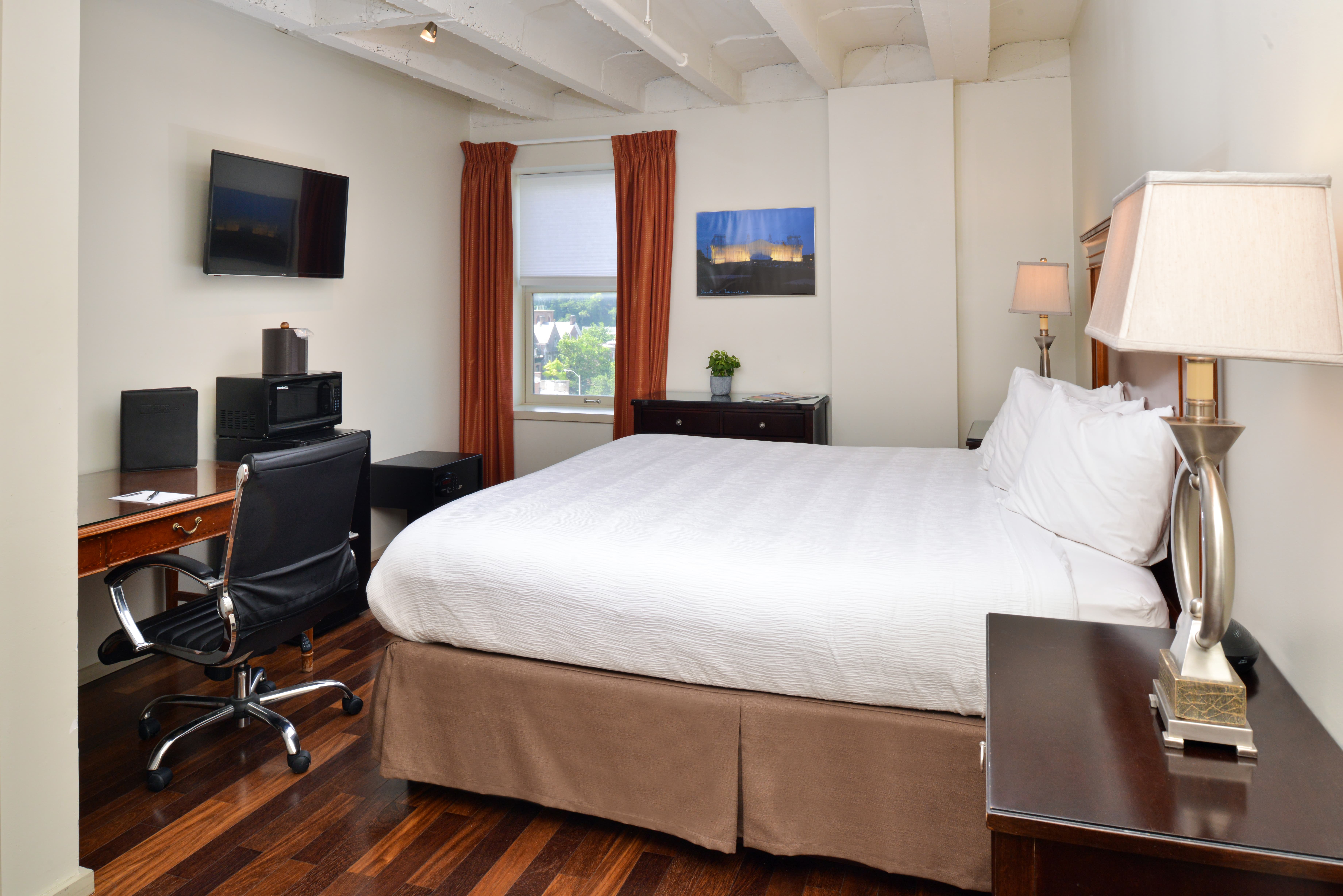 Featuring a king-sized bed with an oversized whirlpool bath, separate shower, original loft-style beamed ceilings, and hardwood floors throughout the room. Comfortably accommodating up to two people. Step into a chapter of Easton’s storied past in our Classic King with Whirlpool, where timeless design meets refined comfort. This room embodies the elegance of a bygone era ideal for couples seeking a romantic escape in one of the most charming historic hotels in Easton, Pennsylvania.