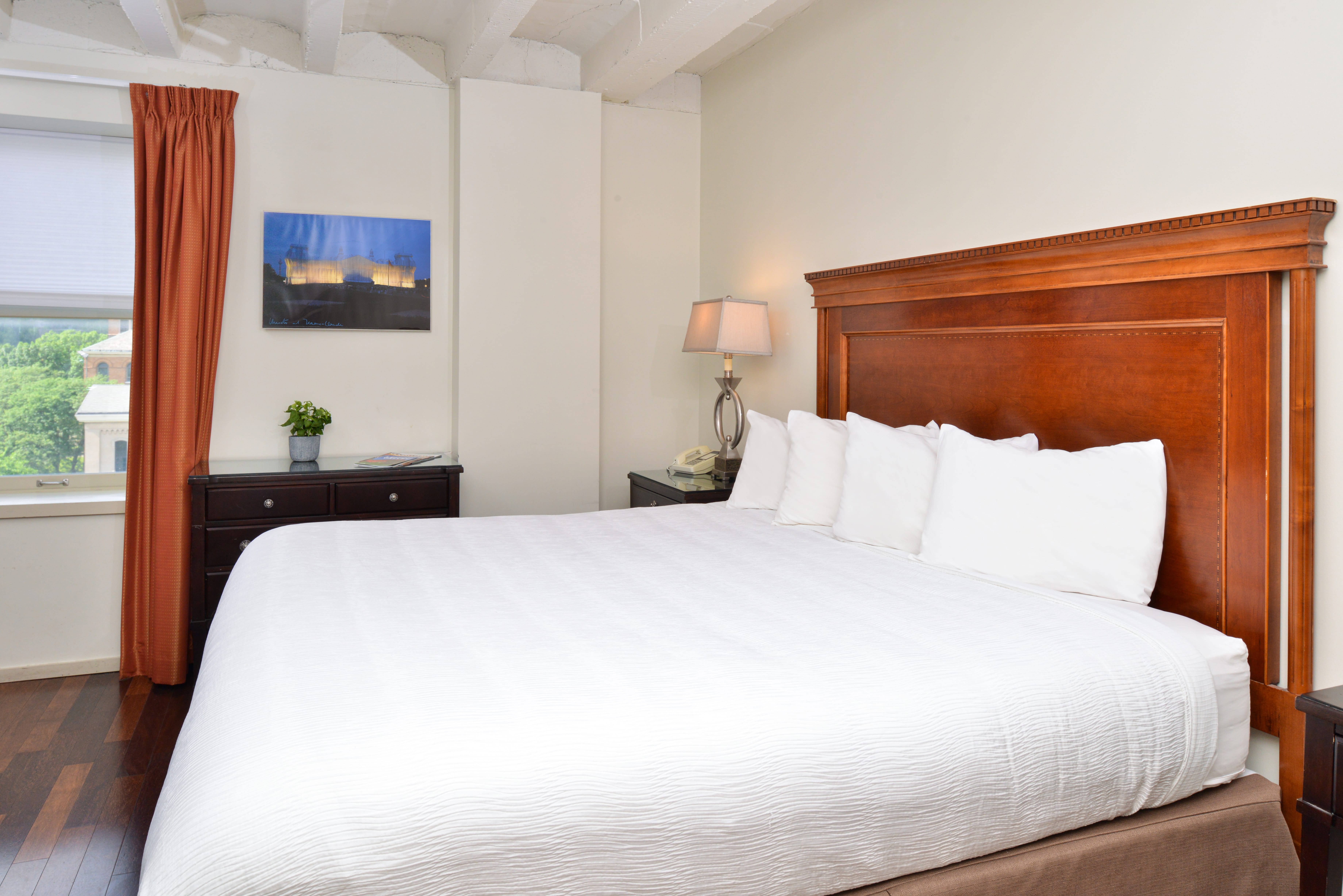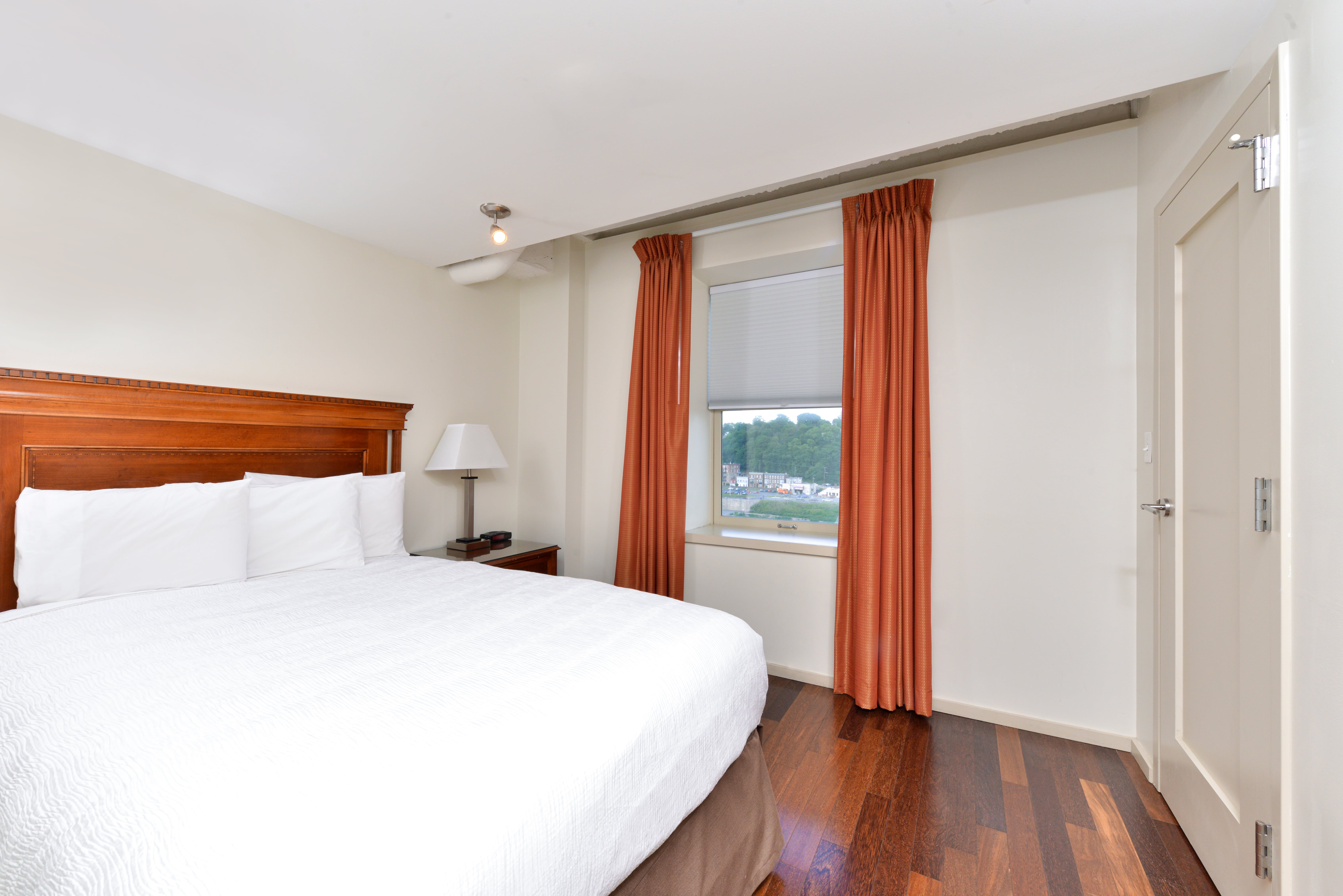 A favorite among families and couples, the Eastonian with Balcony & Whirlpool Tub offers 2 bedrooms, 2 bathrooms, a private balcony with scenic river views, an oversized whirlpool bath, and a full kitchen—a rare luxury in modern Lehigh Valley lodging. With hardwood floors and the industrial character of original loft-style beams, this suite is perfect for romantic escapes or a serene getaway in one of the most beloved boutique hotels in Easton, Pennsylvania.
