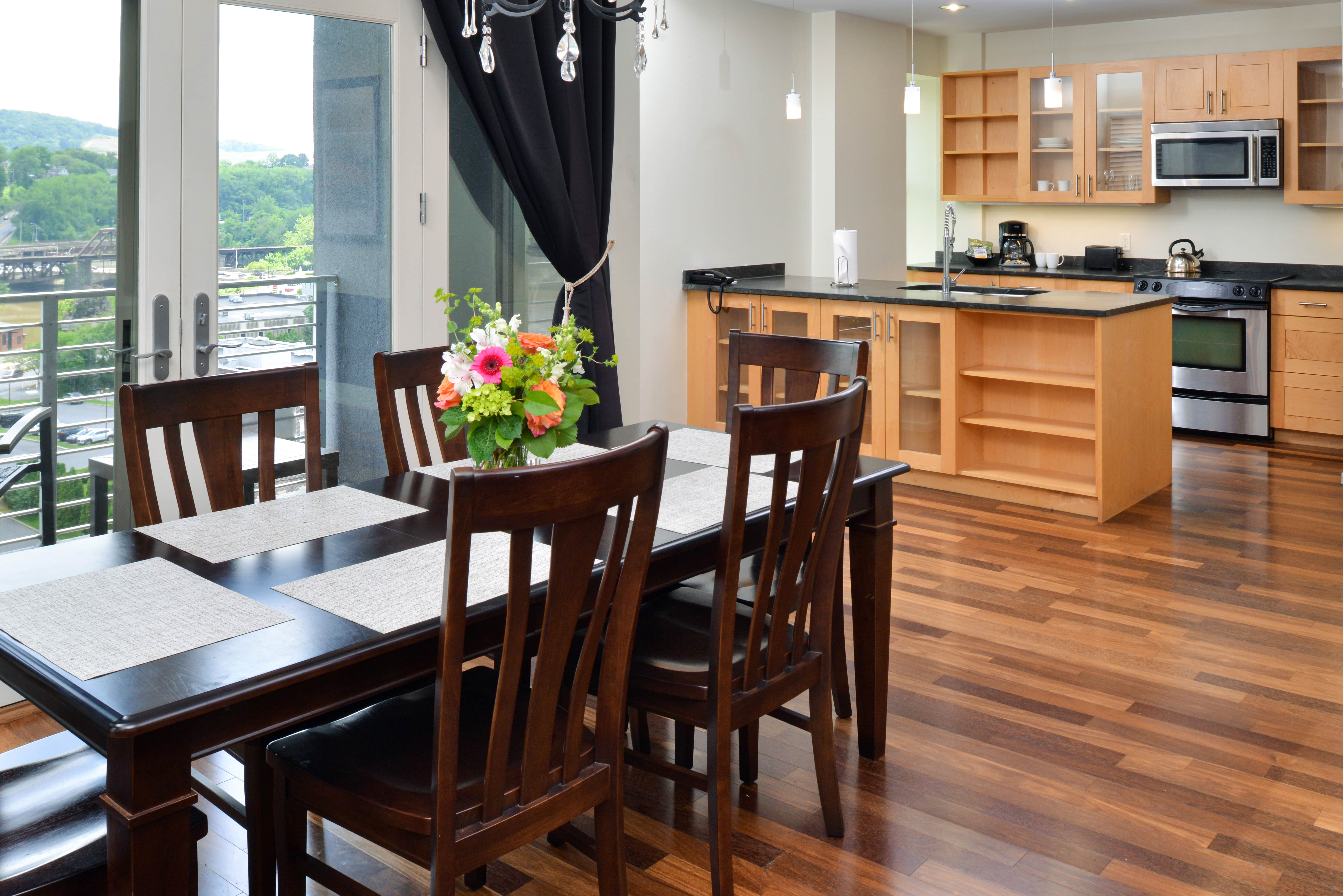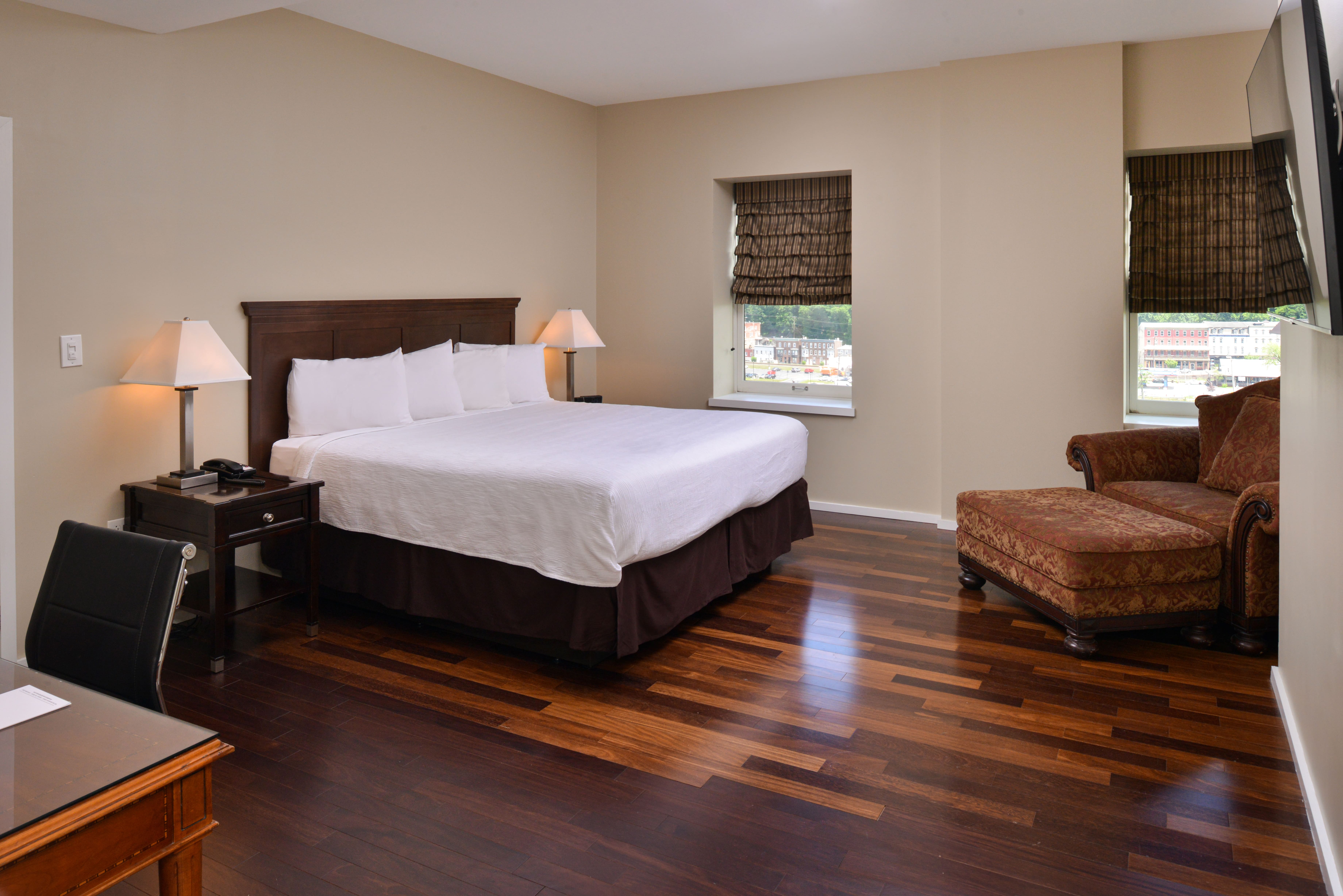 With 2 king bedrooms, 2 bathrooms, a living room with pull-out couch, and a balcony overlooking the junction of the Lehigh and Delaware Rivers, the Presidential Suite captures Easton’s historic grandeur. Featuring soaring loft ceilings, hardwood floors, spacious living areas, and a luxurious whirlpool bath, this suite offers a dignified experience in one of the most memorable boutique hotels in Easton, PA. A favorite for bridal parties, romantic weekends, and extended stays, with a full kitchen and generous living space, it’s perfect for celebrations or long-term stays in the Lehigh Valley.